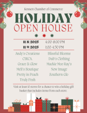 Kennett's Holiday Open House weekend is back on November 8-9. Please shop local this year while shopping for the holidays! Those who visit at least 10 of the 11 participating stores will be entered into a gift basket drawing which includes merchandise and gift certificates from the participating stores.